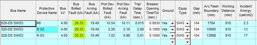 - Bus and branch arcing fault values are automatically calculated and trip times are automatically determined from the protective device settings.