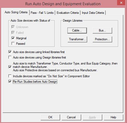 Automatically sizes Cables, Transformers, Buses, and Protective Devices to achieve proper size and ratings that meet criteria limits set by the Equipment Evaluation study. This software is best suited for new system designs or to resolve undersized and/or overdutied equipment for existing systems. Includes user-defined Design libraries to specify equipment that is often purchased.