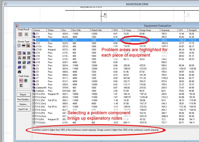 (Left): Each problem criterion is labelled with an asterisk "*". The example shown is a cable whose full-load current has been exceeded in the model. There are other "fail" and "marginal" calculations as well, based on user-selected tolerances for volt drop, current carrying capacity etc.